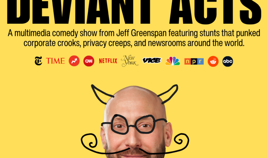 ABOUT THE SHOWDeviant Acts is stand-up with a side of sabotage.Comedian Jeff Greenspan shares behind-the-scenes stories from viral pranks he’s pulled on corporate crooks, privacy creeps, and other modern messes.Before comedy, Jeff was BuzzFeed’s first Chief Creative Officer, worked closely with "Zuck" at Facebook, and was a writer at too many ad agencies to count.He turned what he learned inside the media against it, hijacking news cycles with stunts so bold even NYC’s mayor had to weigh in.Deviant Acts mixes stand-up that roasts advertising, media, and pop culture with footage from stunts like The Tourist Lanes (called “brilliant” by New York Magazine) and the covert installation of The Snowden Statue (featured by Rachel Maddow).Jeff also gets personal, revealing how the media warped his sense of self-worth as a gay man, and how it twists the way we all see ourselves.You’ll leave laughing, thinking, and maybe plotting some schemes of your own.ABOUT JEFFJeff Greenspan is a native New Yorker living in Chattanooga.Before moving south, he appeared regularly at New York’s Gotham Comedy Club and Stand Up New York.Jeff’s sharp, observational comedy has been seen on Netflix, in the writer’s room for filmmaker Michael Moore, and onstage at the Limestone, Red Clay, and Portland Queer Comedy festivals.He performs stand-up across the Southeast, co-produces Chattanooga’s Don’t Tell Comedy shows, and recently sold out his one-man show at NYC’s Caveat Theater.